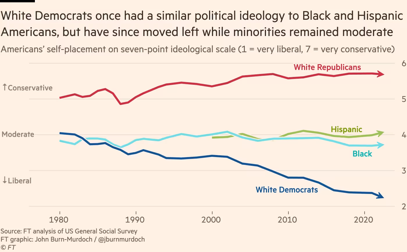 The situation is similar in the US, where the sharp leftward turn among educated white liberals has caused white Democrats to overshoot the minority position on a growing number of issues, including immigration, racism, patriotism and meritocracy.