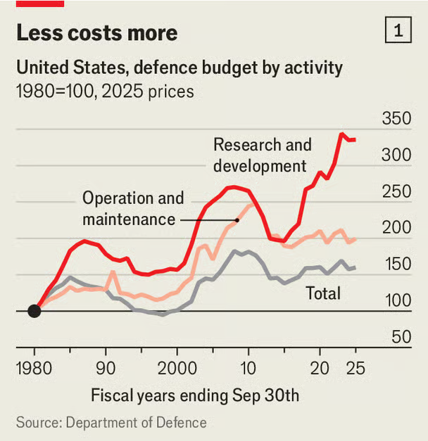 Since 1980, as weapons have become more complicated, the portion of the armed forces’ budget going to care for and repair existing systems has doubled (see chart 1).