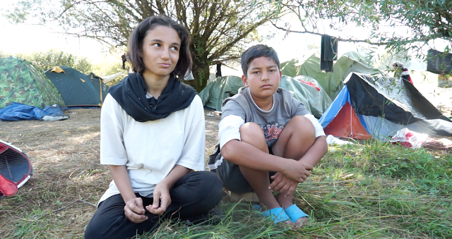Now, she is sitting in the grass on the Bosnian side of the border with her little brother Farzin.